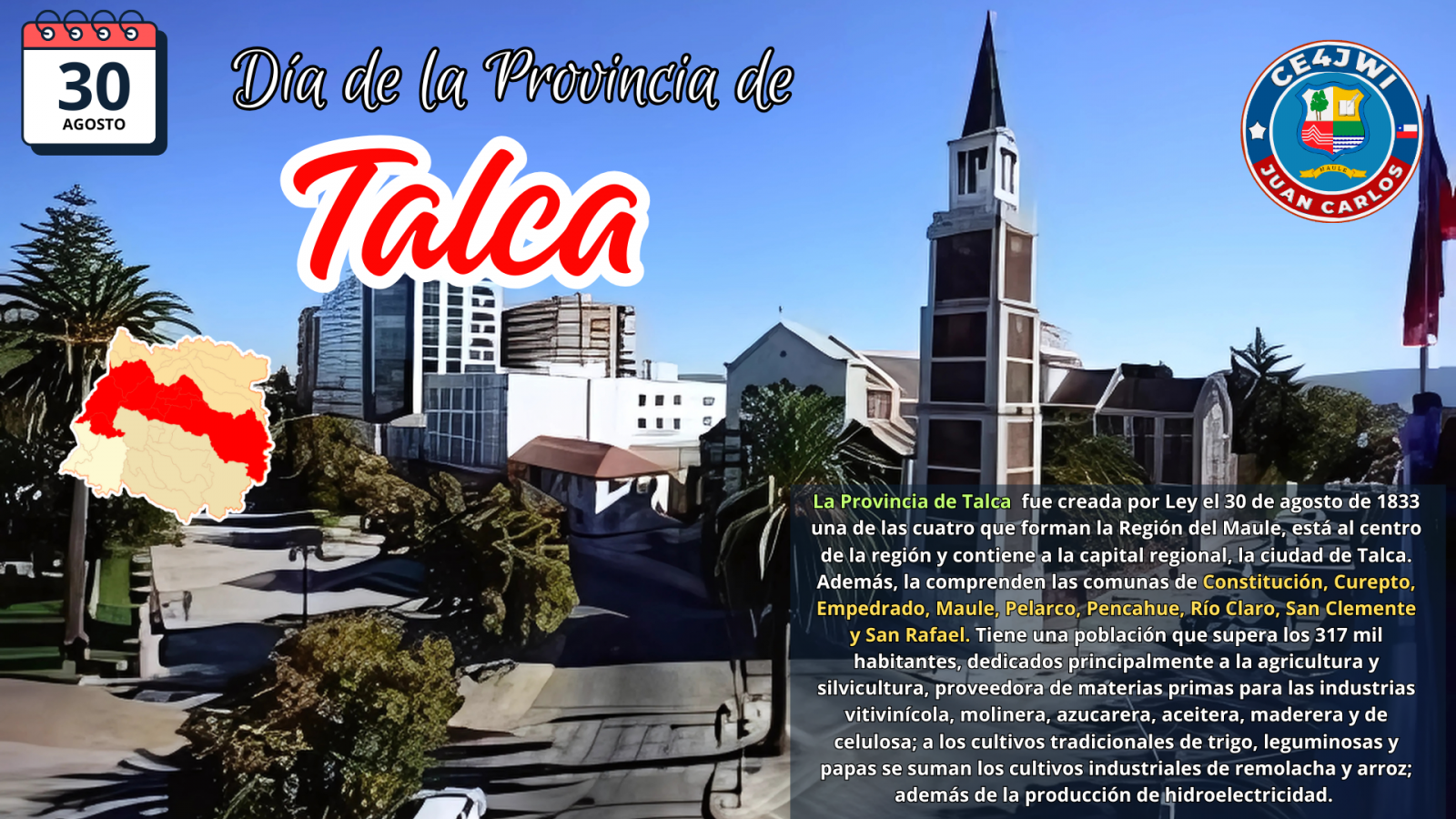 La Provincia de Talca es una de las cuatro que forman la Región del Maule, está al centro de la región y contiene a la capital regional, la ciudad de Talca. Además, la comprenden las comunas de Constitución, Curepto, Empedrado, Maule, Pelarco, Pencahue, Río Claro, San Clemente y San Rafael. Tiene una población que supera los 317 mil habitantes, dedicados principalmente a la agricultura y silvicultura, proveedora de materias primas para las industrias vitivinícola, molinera, azucarera, aceitera, maderera y de celulosa; a los cultivos tradicionales de trigo, leguminosas y papas se suman los cultivos industriales de remolacha y arroz; además de la producción de hidroelectricidad. Sus principales atractivos naturales son la Reserva Nacional Altos de Lircay, La Piedra de la Iglesia de Constitución, la Ruta Internacional Pehuenche y Humedal y Dunas de Putú, mientras que sus atractivos culturales están representados en el Museo O´Higginiano (donde se firmó la Declaración de la Independencia de Chile el 12 de febrero de 1818), el Monumento Histórico Templo San José de Pelarco, la Zona Típica de Curepto, ex Casa Patronal Huilquilemu, el Buscarril del Ramal Talca-Constitución, la Ruta del Vino Valle del Maule y el Teatro Regional del Maule