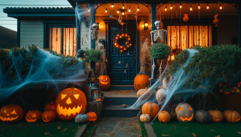 - Decoraciones: Las casas y negocios se decoran con calabazas talladas, telarañas falsas, esqueletos y luces espeluznantes. Los animatronics y las figuras inflables también son populares para crear un ambiente verdaderamente aterrador.